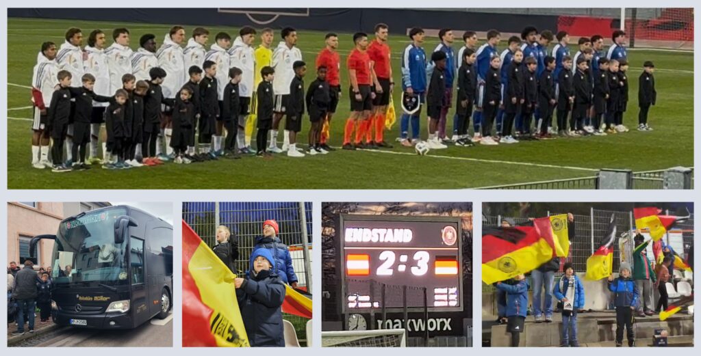 An jedem der 3 Spieltage trafen sich unsere Mannschaften mit Eltern und Geschwistern am Roßdörfer Schwimmbad um mit dem großen Reisebus in Richtung Maxworx Sportpark zu starten. Angekommen im Stadion wurden die Kids mit schwarzen Adidas Outfits einheitlich ausgestattet und man bereitete sich in der Kabine auf die Spiele vor. Um kurz vor 18:00 Uhr war es dann immer soweit: zwischen 26 und 30 unserer Kids liefen mit viel Stolz Hand in Hand mit den U19 Nationalspielern vor den Augen der zahlreichen Zuschauer ein und man stand neben den Profis, als diese ihre Nationalhymnen sangen. Im Anschluss ging es in den Block E. Gemeinsam mit den mitgereisten Eltern und Geschwistern wurde unsere Nationalmannschaft lautstark unterstützt.